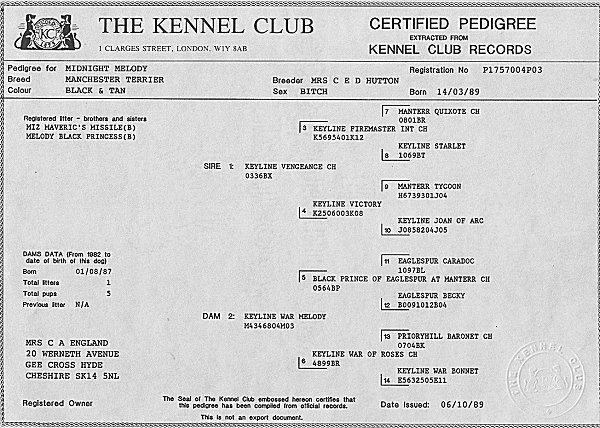 Penny was born on the 14th March 1989, the last of a litter of 5 pups. A Manchester Terrier, her Pedigree includes a number of breed champions.