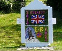 Although well-dressing is a custom mostly confined to Derbyshire, it can be seen in adjacent counties too. Well dressing celebrations were held regularly in Gee Cross from the 1820s until 1878. The custom was revived by the local Women's Institute in 2000. Information can be found about this on the Tameside Local History Forum website. The 2013 event followed the format of previous years. Shortly after 2pm the Adamson's Band led a procession from the Grapes Hotel up Joel Lane to Arnold Hill Well and Slateacre Well. At each well a blessing was given and a verse and refrain of the hymn "All Things Bright and Beautiful" were sung. The procession returned down Joel Lane and along Stockport Road to the site of Baron Road Well, across to the Methodist Church and along to the Village Green Well. It was then back to Booth's Well by the Grapes Hotel, and onto Hyde Chapel where there was a display created by pupils of Alder Community High School. Inside Hyde Chapel there was then a community service followed by entertainment and refreshments. |